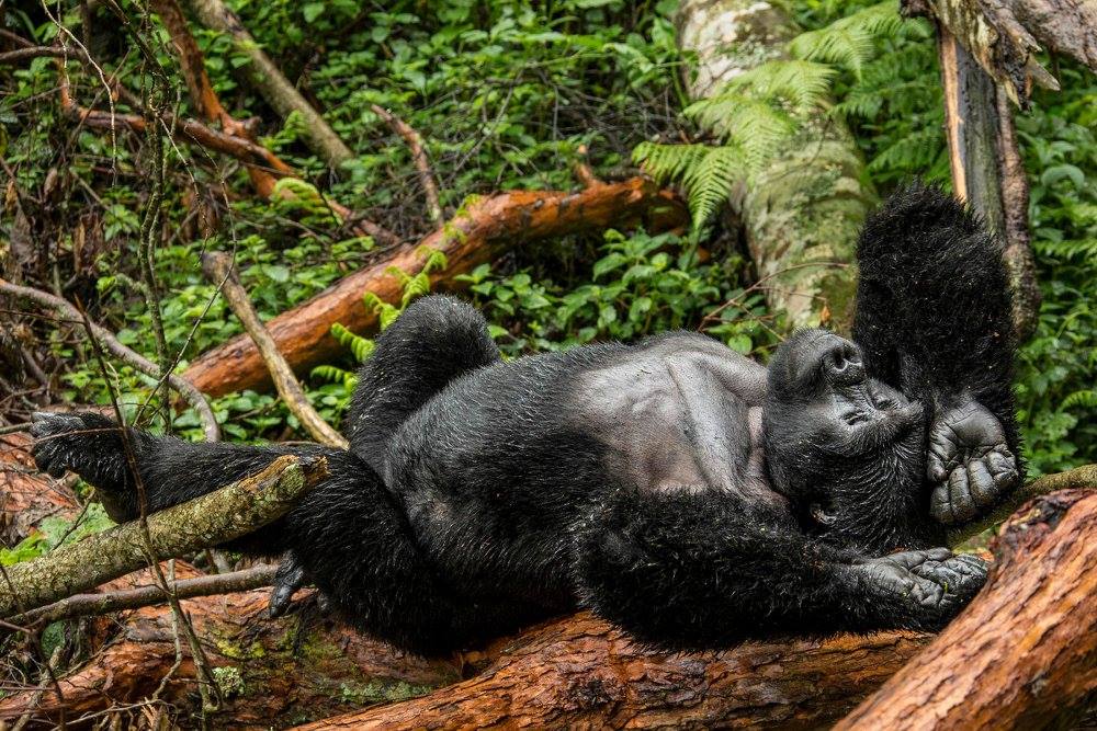 A silverback lounges on a suspended fallen tree in the sun in Bwindi Impenetrable Forest, Uganda par Bruce Miller Publié par budpumba le 4 juin 2017